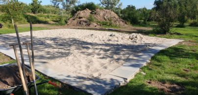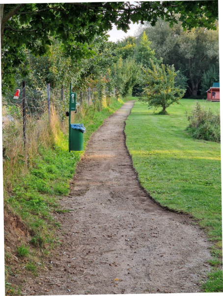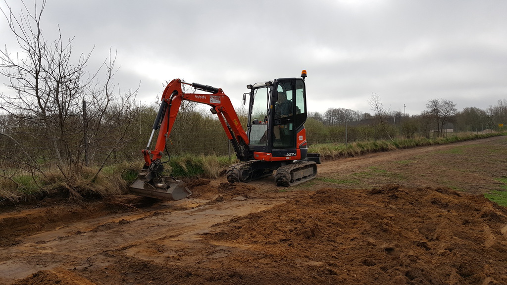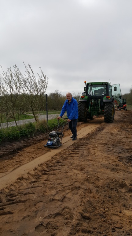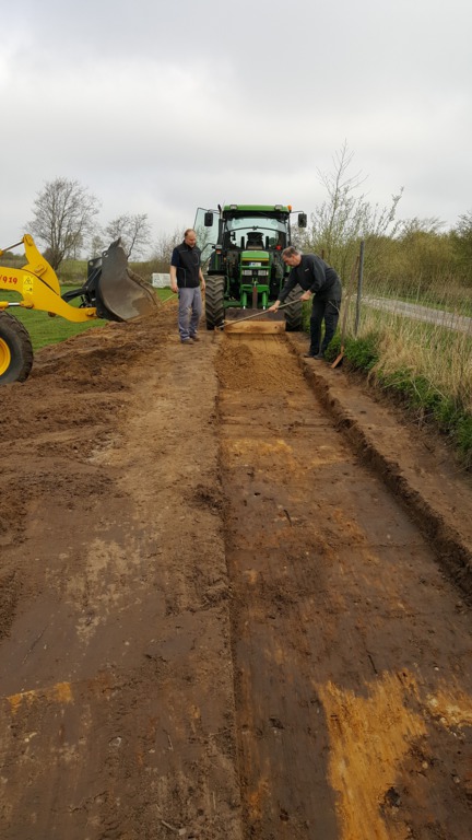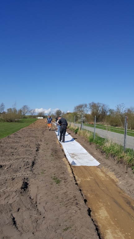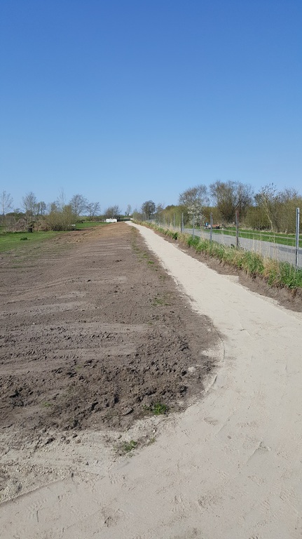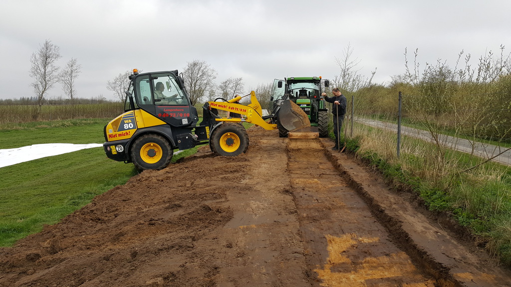 Das haben wir nun geändert. Fast 200 Tonnen Erde und Füllmaterial wurden bewegt, um in 2 Tagen einen neuen Weg zu schaffen. In die 3 Aufbauschichten haben wir ein Flies eingearbeitet, um den Maulwürfen auf dem Weg keine Chance zu geben.