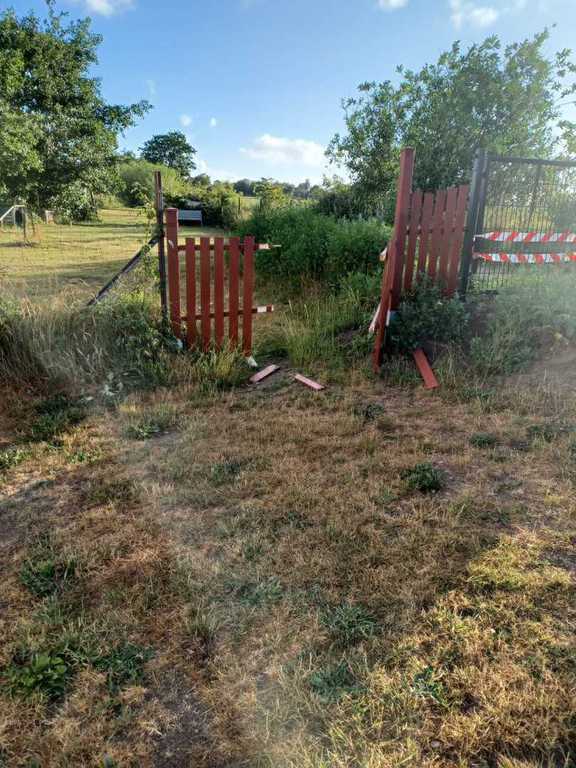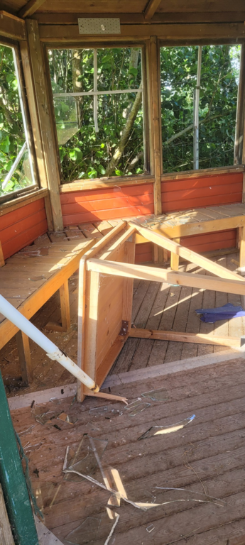 Drei Wochen später wurde die hintere Hütte fast komplett zerstört. Fast alle Scheibe eingeschlagen und Teile des Inventars zerstört. Der neue Zaun, der den hinteren Teil des Freilaufs abgrenzt wurde eingetreten.