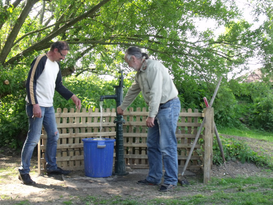 Horst, Wolfgang, Frank und Udo haben sich mächtig ins Zeug gelegt – und nun können wir aus elf (!) Metern Tiefe endlich unserer eigenes Nass fördern.